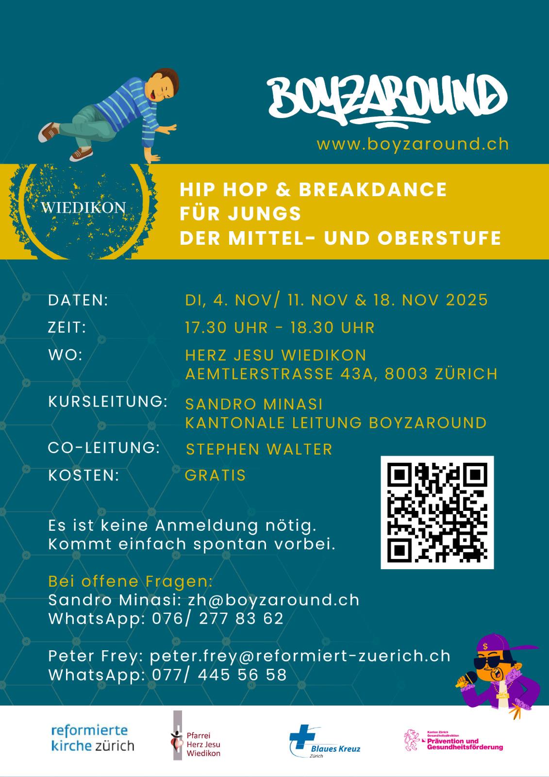 Jungs der Mittel- und Oberstufe sind herzlich eingeladen, an drei offenen Hip-Hop- und Breakdance-Workshops teilzunehmen. Unter der Leitung von Sandro Minasi, dem kantonalen Leiter von Boyzaround lernen die Teilnehmenden verschiedene Tanzbewegungen und Choreografien kennen. Im Mittelpunkt stehen Bewegung, Rhythmus und gemeinsamer Spass.